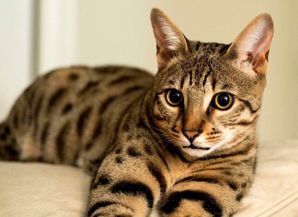 Эксперименты по скрещиванию сервала и домашней кошки проходили на кошачьей ферме заводчика Джуди Фрэнк в США в начале 1980-х. Первый жизнеспособный котенок родился в 1986 году, его назвали Саванна, так и родилось название породы. Чтобы понять, какие гены унаследовала порода больших кошек Саванна, опишем характеристики сервала. Это достаточно крупная кошка, длина тела достигает 135 см, внешне напоминает гепарда, у него пятнистый окрас, маленькая голова и непропорционально большие уши, как локаторы. Сервал великолепный охотник, высоко прыгает, до 3 метров в высоту, любит и умеет плавать.